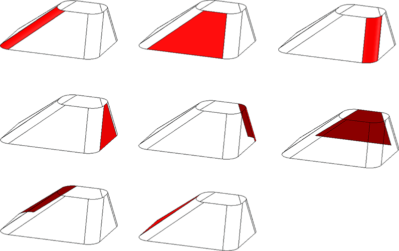 Mit dieser Funktion erzeugen Sie Übergangsteile zwischen zwei Kurven. Diese Kurven können Bestandteil einer 3D-Skizze sein oder Randkurven von Solids oder Flächenteilen. Im Unterschied zur Funktion Übergangsteil verbinden können Sie hier keine Anschlussbedingungen vergeben. Die beiden identifizierten Randkurven werden linear miteinander verbunden. Zu je zwei verbundenen Kanten entsteht dabei eine Freiformfläche vom Typ B-Spline oder NURB. Die verschiedenen Freiformflächen haben je vier Kanten und sind topologisch nicht miteinander verbunden.