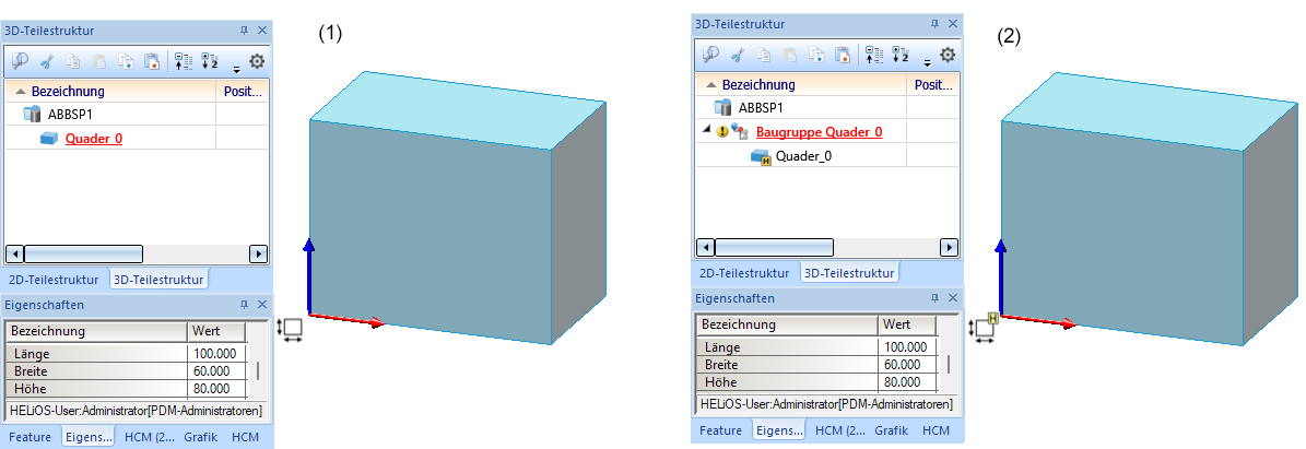 In der Abbildung wurde ein Quader mit Länge 100, Breite 60 und Höhe 80 eingebaut (1) und anschließend in eine Baugruppe umgewandelt (2). Die Baugruppenabmessungen und die Abmessungsausrichtung entsprechen der des Quaders.