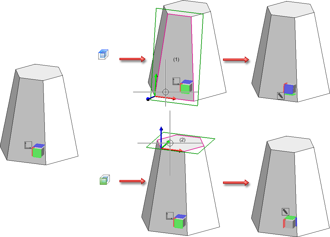 In der folgenden Abbildung ist die Teileausrichtung des Prismas geändert worden. Links ist als Draufsicht die Ebene (1) gewählt worden, rechts als Vorderansicht die Ebene (2).
