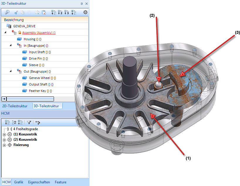 Die hier verwendete Konstruktion GENEVA_DRIVE.SZA finden Sie - bei lokaler Installation der Hilfe - im HiCAD-Unterverzeichnis Docu\1031\examples.