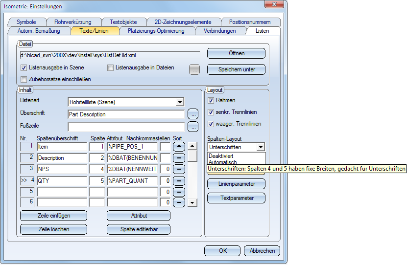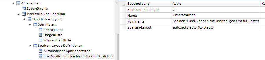 - Anlagenbau > Isometrie und Rohrplan > Stücklisten-Layout > Spalten-Layout-Definitionen.