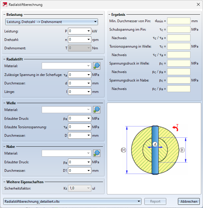 Mit dieser Funktion prüfen Sie, ob ein zur Verbindung von Welle und Nabe eingesetzter Radialstift unter Belastung die nötige Stabilität gewährleistet oder versagt. Die Funktion berechnet den Mindestdurchmesser des Stiftes, die Schubspannung im Stift, die Torsionsspannung und den Spannungsdruck in der Welle sowie den Spannungsdruck in der Nabe.