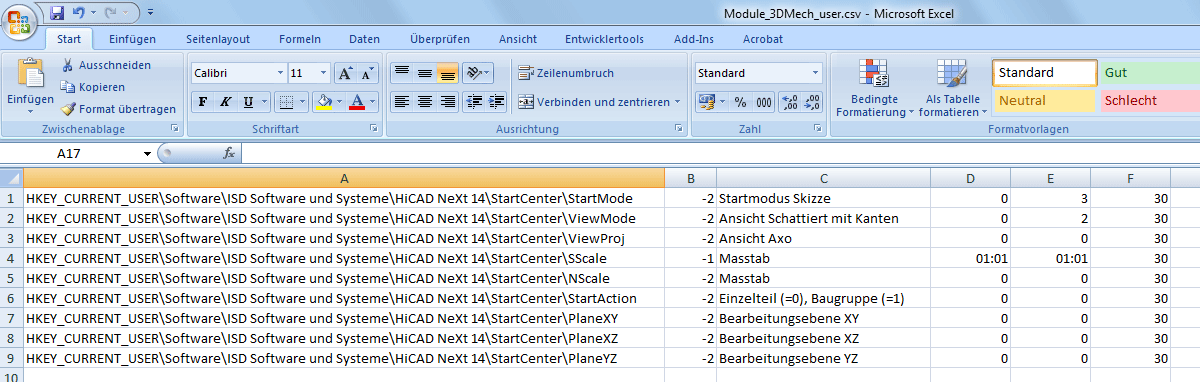 Haben Sie in Spalte A eine DAT-Datei, einen Registry Eintrag oder den Namen einer Konfigurationsvariable angegeben, dann geben Sie in Spalte D den Standardwert (Default) der Einstellung/Variable an. Bei anderen Dateien muss hier der Name der Originaldatei angegeben werden und zwar inkl. des Namens des HiCAD-Unterverzeichnisses. Die ISD Originaldateien liegen im HiCAD Unterordner TEMPLATES\DEFAULT\SYS. |