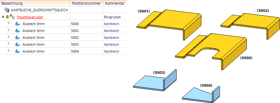 Die abgebildete Konstruktion enthält 5 Alubleche. Dabei haben die Bleche 5001 und 5002 zwar unterschiedliche Blechtiefen, sind aber querschnittsgleich und unbearbeitet. Für Blech 5000 gilt dies nicht, da dieses Blech eine Ausnehmung hat, also bearbeitet wurde. Analog ist Blech 5003 unbearbeitet und Blech 5004 aufgrund der Ausnehmung bearbeitet.