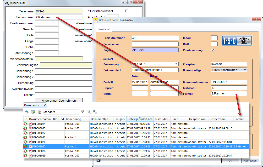 HiCAD-Attribut des Zeichnungsrahmens der Fertigungszeichnung Beim Erstellen von Fertigungszeichnungen wird das HiCAD-Attribut Sachnummer ($BB) des Zeichnungsrahmens auf das HELiOS-Dokumentattribut FORMAT übertragen.