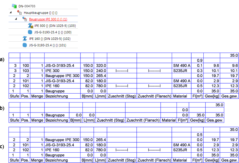 Ein kleines Beispiel: Die Abbildung zeigt die Teilestruktur einer Konstruktion und Strukturstücklisten der Konstruktion: a) Keine der Baugruppen ist vormontiert. b) Baugruppe 1 ist vormontiert, Baugruppe 2 nicht.. c) Baugruppe 2 ist vormontiert, Baugruppe 1 nicht.