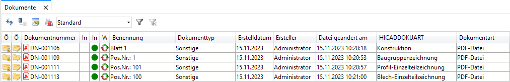 Dokuart der Konstruktion Beim Erstellen externer Unterlagen, z. B. von PDF-Dateien, wird die Kennzeichnung des Dokuments, z. B. PDF-Datei, dem HELiOS-Attribut DOKUART zugewiesen. Das Attribut DOKUART der Konstruktion, aus der die externen Unterlagen abgeleitet werden, wird dem Attribut HICADDOKUART der externen Unterlagen zugeordnet, z. B.