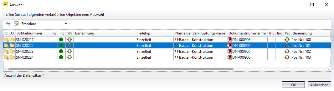- Haben Sie die Funktion im Gesamtmodell aufgerufen, dann wählen Sie zunächst die Bauabschnitte in denen das Teil gesucht werden soll und die gewünschten Einzelteile.