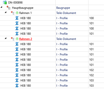 In der Teilestruktur sieht man, dass das Profil mit der Positionsnummer 101 in beiden Bauabschnitten mehrfach vorkommt.