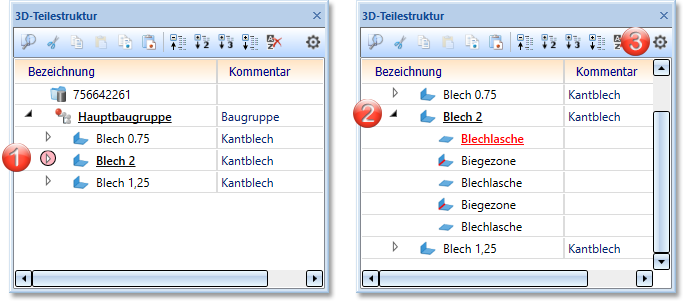 Blechlaschen und Biegezonen werden als gleichberechtigte Nebenteile des übergeordneten Kantblechs erzeugt. Die Kantbleche können dann in Baugruppen oder in einer Hauptbaugruppe zusammengefasst werden.