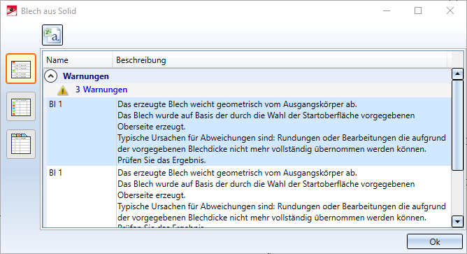 Treten bei der Generierung Abweichungen vom geometrischen Ausgangskörper auf, werden diese nach dem erzeugen der Blechteile aufgelistet.