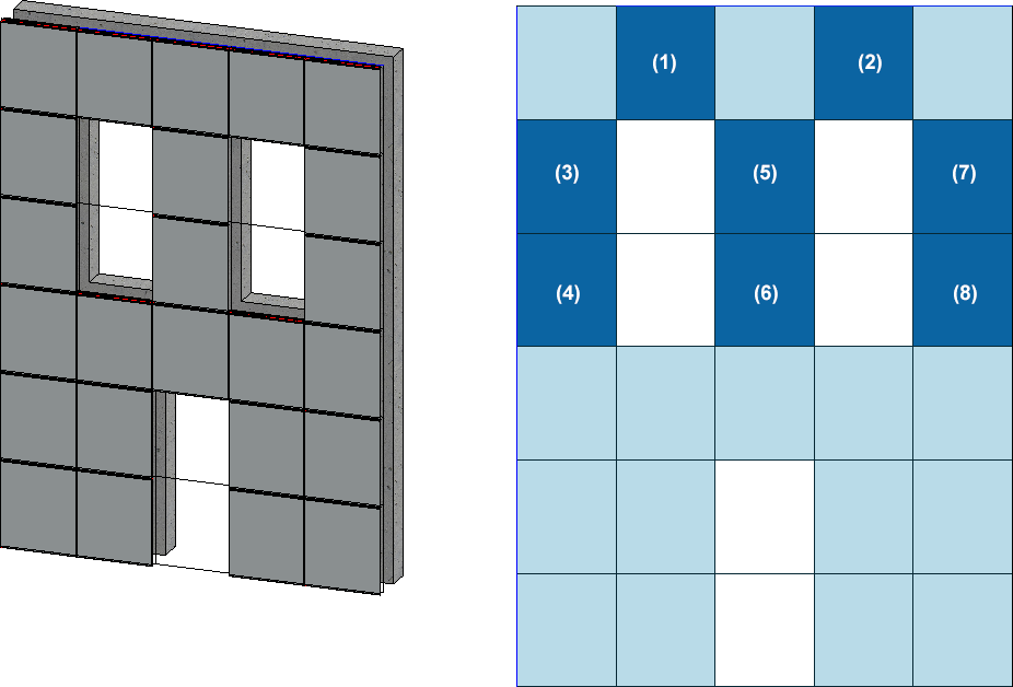 Wir verwenden das Beispiel aus dem Abschnitt Elementverlegung durchführen. Hier sollen die Verlegeelemente der dunkelblauen Bereiche (1) bis (8) geändert werden und zwar soll nicht die Standardausführung verwendet werden, sondern der Fensteranschluss.