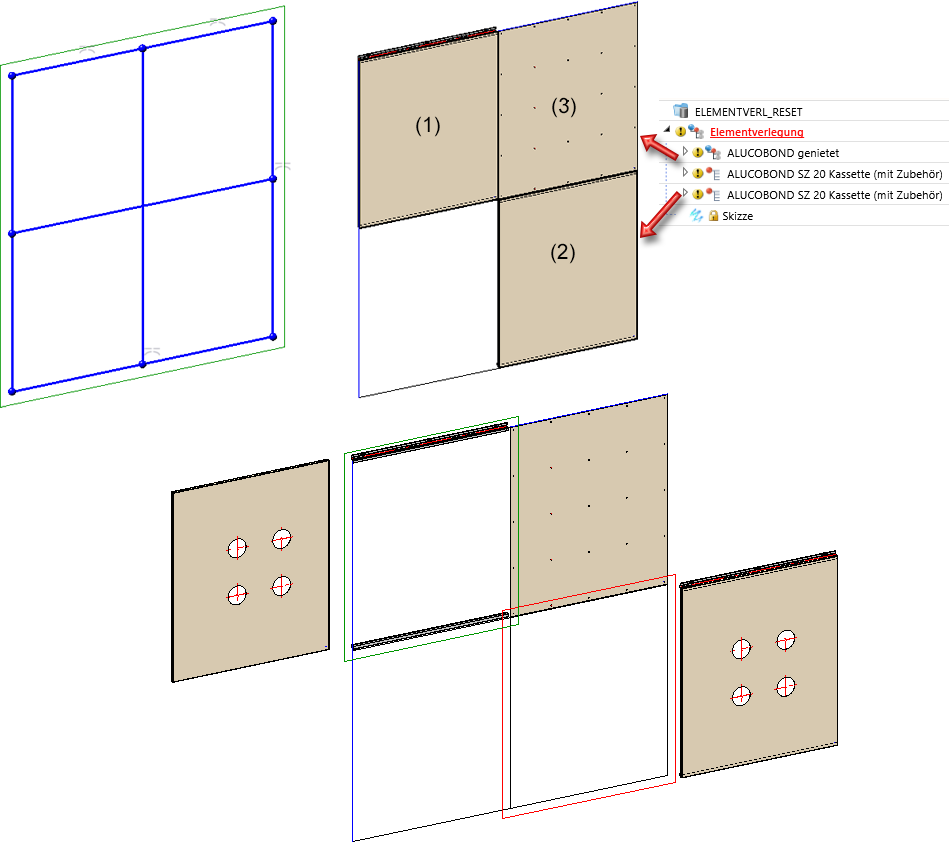 In der folgenden Abbildung wurde für Felder (1) und (2) der Skizze die Variante ALUCOBOND SZ 20 Kassette mit den Default-Parametern gewählt, für das Feld (3) die Variante ALUCOBOND genietet. Anschließend ist das komplette Verlegeelement (2) gebohrt und verschoben worden. Beim Verlegeelement (1) wurde nur das Blech gebohrt und verschoben.