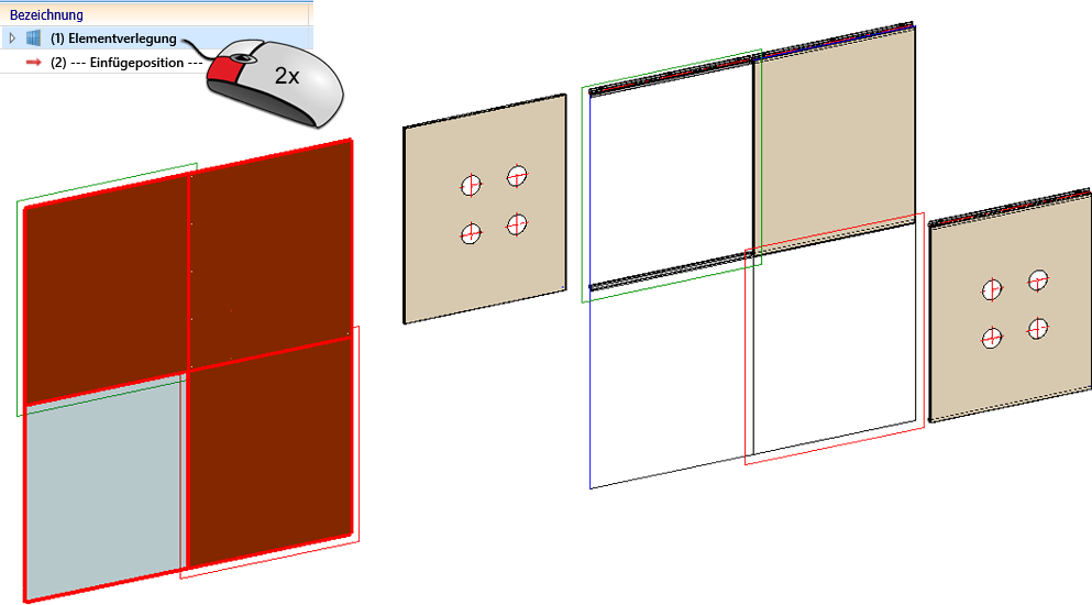 - Beim Bearbeiten einer Elementverlegung wird keine komplette Neuberechnung durchgeführt, sondern es werden nur die zur Bearbeitung ausgewählten Verlegeelemente behandelt. Haben Sie beispielsweise Teile eines Verlegeelementes mit Funktionen außerhalb der Elementverlegung bearbeitet, z. B. verschoben, gelöscht oder gebohrt und wird dieses Verlegeelement nicht durch Auswahl einer anderen Variante oder Änderung der Parameter verändert, dann bleiben diese Teile verschoben, gelöscht, gebohrt etc.