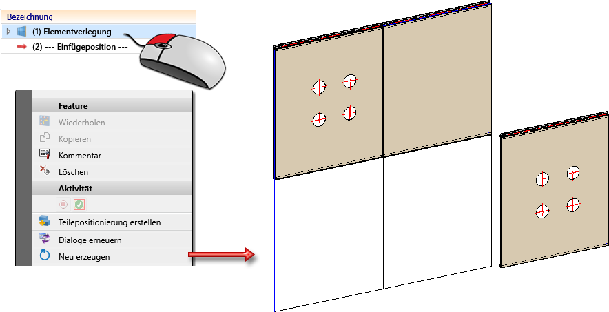 - Wollen Sie die Elementverlegung komplett löschen - einschließlich der Baugruppe Elementverlegung - dann können Sie auch mit der rechten Maustaste auf den Feature-Eintrag klicken und dort im Kontextmenü die Funktion Löschen wählen.