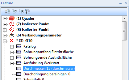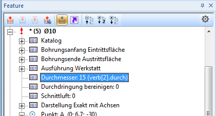 - Ändern Sie die Feature-Einträge der Bohrungen in der Eternit-Platte, indem Sie den Durchmesser zur Variablen