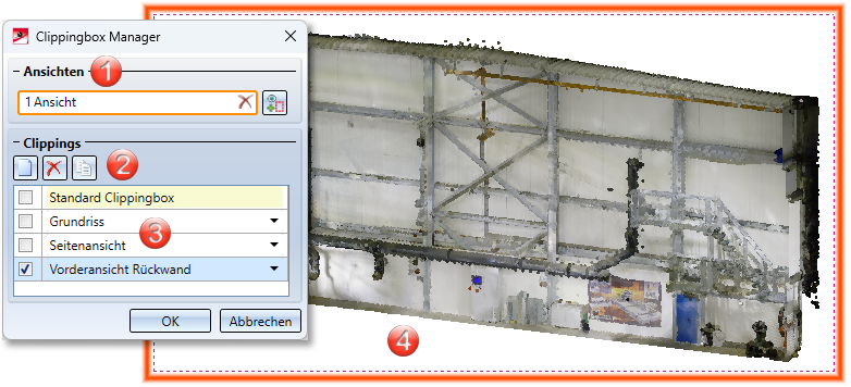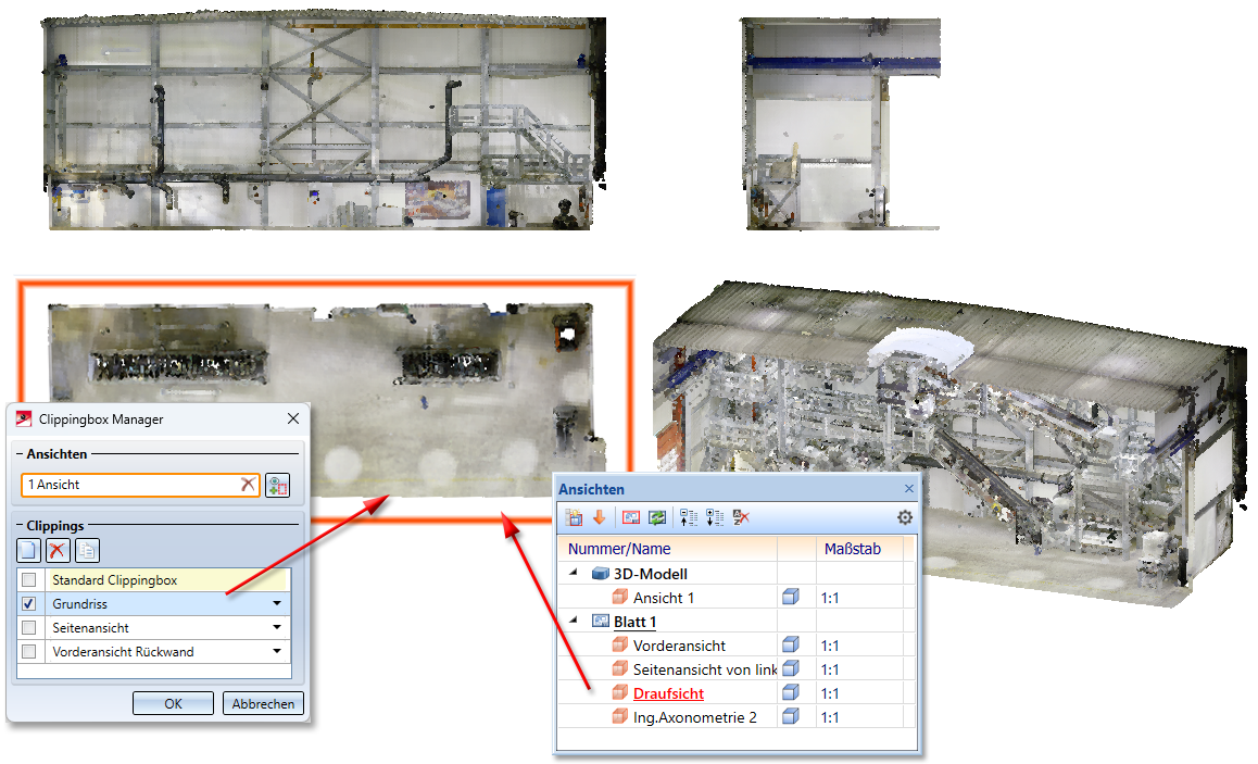 In der Blattansicht können Sie den verschiedenen Ansichten (Vorderansicht,Draufsicht, ...) unterschiedliche Clippings (Ausschnitte) der Punktwolke zuweisen.