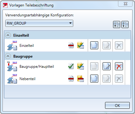 Starten Sie hierzu die Funktion Konstruktion > Positionierung / Detaillierung > Zeichnungsableitung > Vorlagen zur Teilebeschriftung bearbeiten. Wählen Sie im Dialogfenster bei Verwendungsartabhängige Konfiguration den Eintrag RW_GROUP aus.