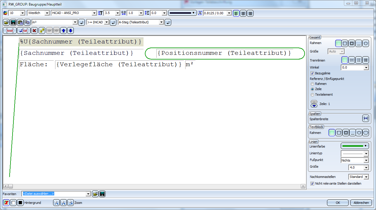 Der "äußere" Teil %COD(...)%NUM(%HID) ist dabei vorgegeben und muss auf jeden Fall bestehen bleiben. Der Teil zwischen den Klammern kann frei vergeben werden. Dieser lautet hier also: Pos.%U%TA(%PI) / %U%TA(DWF_BUNDLE_SIZE) . Stck. X %U%TA(§25). Dabei kennzeichnet %TA die Attribute eines Teils. (TA steht dementsprechend auch für Teile-Attribute.) In Klammern folgt dann das abzufragende Teileattribut. %TA($BB) bezeichnet also das Teileattribut $BB des Profils - die Sachnummer.