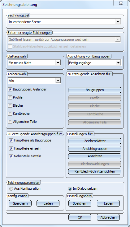 Klicken Sie anschließend auf Konstruktion > Positionierung / Detaillierung > Zeichnungsableitung. Wählen Sie bei Teileauswahl nur den Punkt Baugruppen, Geländer an. Klicken Sie auf OK.