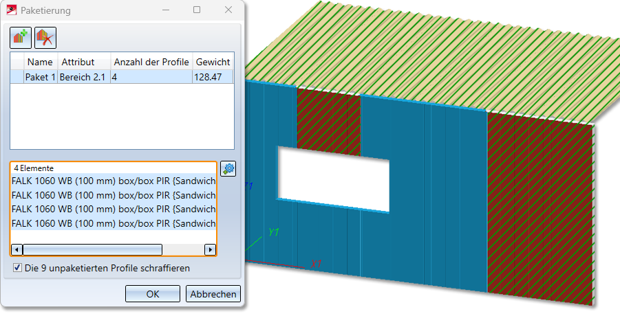 Im unteren Bereich des Dialogfensters finden Sie die Option Die x unpaketierten Profile schraffieren. Statt x wird dort angezeigt, wie viele Profile in der Verlegung existieren, denen noch kein Paket zugewiesen wurde. Wenn Sie diese Option aktivieren, werden in der Konstruktion alle betroffenen Profile durch eine Schraffur hervorgehoben: