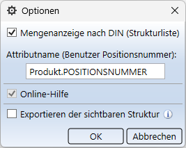 Hier kann eingestellt werden, ob die Anzahl einer Position nach HiCAD2-Logik oder nach "DIN-Norm", d. h. mit Multiplizieren der Anzahl der übergeordneten Baugruppen berechnet werden soll. Standardmäßig ist die Berechnung nach DIN-Norm voreingestellt.
