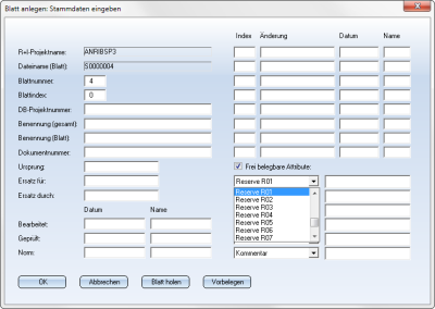 Bei eingeschalteter Datenbank werden die Informationen automatisch aus der Datenbank übernommen. Blattnummer, Index und Benennung des Blattes können Sie ändern.