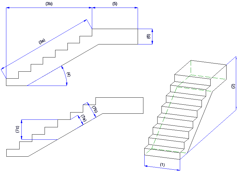 Die nachfolgende Abbildung zeigt eine Betontreppe mit 8 Steigungen und den verschiedenen Treppenparametern.