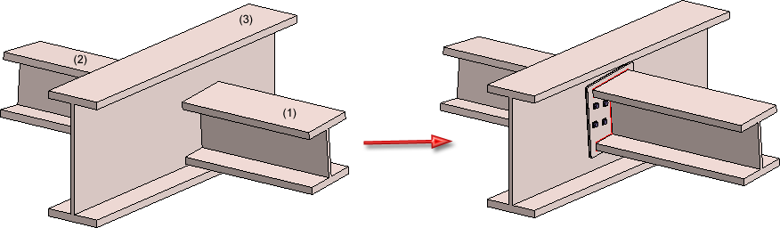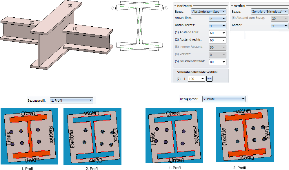 Mit dieser Funktion schließen Sie zwei Profile mit geschraubten Stirnplattenanschlüssen an ein drittes Profil an. Der Anschluss kann dabei sowohl an Steg als auch an Flansch erfolgen - mit oder ohne Futterbleche.