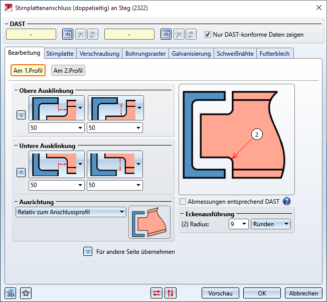 Die Bedienung der Registerkarten erfolgt im Wesentlichen analog zu denen des Anschlusses Stirnplattenanschluss an Steg/Flansch (2320) mit folgenden Abweichungen: