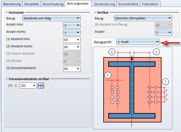 Auf der Registerkarte Bohrungsraster können Sie unter Bezugsprofil bestimmen, auf welches der beiden anzuschließenden Profile sich die Einstellungen beziehen sollen.
