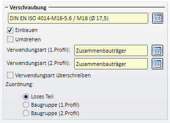 Unter Verwendungsart können Sie festlegen, welche Verwendungsart der Baugruppe des ersten und zweiten Profils zugeordnet werden soll. Ist den Baugruppen der Profile bereits eine Verwendungsart zugeordnet, dann lässt sich über die Checkbox Verwendungsart überschreiben festlegen, ob diese Verwendungsart erhalten oder durch die auf der Registerkarte Verschraubung gewählte Verwendungsart ersetzt werden soll.