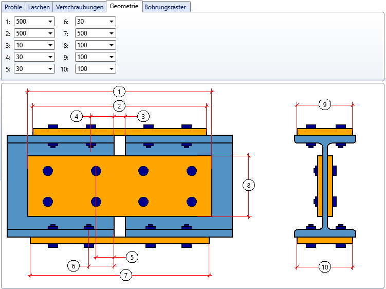 Für die gewählten Laschen bestimmten Sie hier die Anzahl und die Anordnung der jeweiligen Verschraubungen, d. h. die Anzahl der .Verschraubungen in X- und Y-Richtung. Das Raster ist für die Laschen am oberen und unteren Flansch sowie am Steg separat einstellbar. Dabei sind die Einstellungen des Bohrungsrasters symmetrisch für das 1. und 2. Profil.