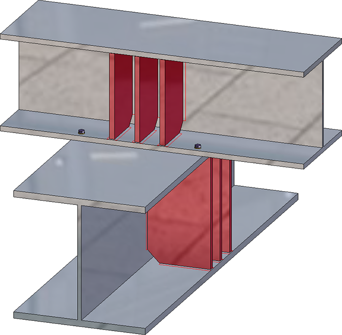 Mit dieser Variante verschrauben Sie ein Profil (Pfette) und einen Träger (Binder) mit maximal 4 Schrauben. Zur Verstärkung können an der Pfette und am Träger bis zu 3 Steifen eingebaut werden.