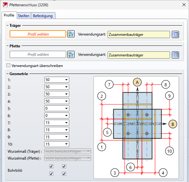 Sollen die Wurzelmaße der Pfette bzw. des Trägers (bei Profileisen der Abstand der Nietreihen in Steg oder Flansch von bestimmten Kanten des Querschnitts) in den Bohrungsreihen berücksichtigt werden, dann wählen Sie dies in der jeweiligen Listbox aus.