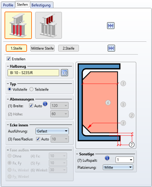 Bestimmen Sie Halbzeug, Typ und Abmessungen sowie die Ausführung der drei Steifen. Soll eine Steife nicht erzeugt werden, dann deaktivieren Sie die Checkbox Erstellen.