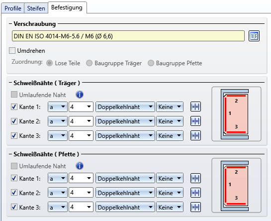 Die Steifen werden mit der Pfette bzw. dem Träger verschweißt. Durch Aktivierung der entsprechenden Checkboxen legen Sie hier fest, welche Schweißnähte zwischen Profil und Steifen erzeugt werden sollen: