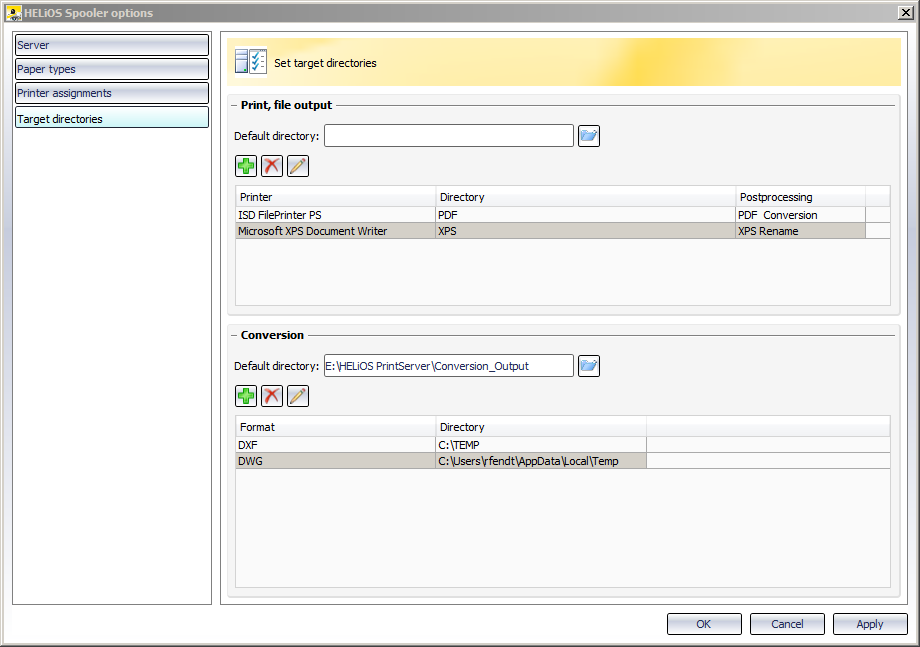 In the Default directory input field, you can specify further rules for target directories and post-processing for various printers.