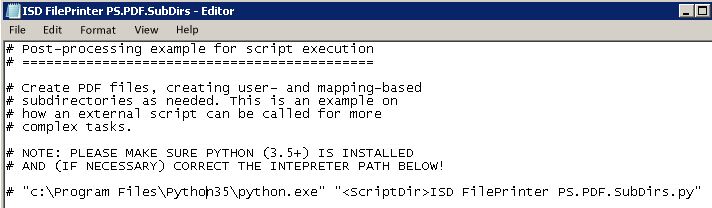 This file calls the python script for the purpose of further processing ISD FilePrinter PS.PDF.SubDirs.py, which can be found in the same directory. By adjusting the file accordingly you can, for instance, send print jobs of particular users and/or host computers to particular directories.