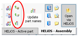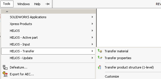 Functions for data transfer from CAD to HELiOS can be found in the the SolidWorks menu Tools > HELiOS - Transfer and, in the form of a function group, on the HELiOS - Part/ Assembly/ DrawingRibbon tab.