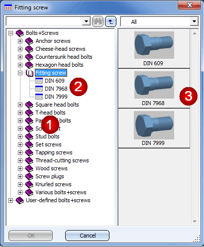 The catalogue structure is displayed on the left side of the selection window. A catalogue can be sub-divided into further catalogues and contains the available standard series on the lowest level. For example, the BOLTS catalogue contains the CYLINDER HEAD BOLTS sub-catalogue, which contains the corresponding standard series DIN6912, DIN7984 etc. Each catalogue (1) is marked by a book symbol , the standard series (2) by . A graphic preview (3) is displayed for each catalogue on the right of the window.