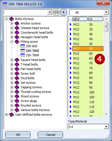 You choose the desired standard series similarly by clicking the corresponding symbol or the graphic symbol. Next, the right-hand side of the window displays a list (4) of parameters, e.g. THR (thread diameter) and LN (bolt length), in which the standard part is available.
