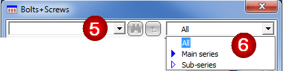 Use the Filter option (6) to restrict the display of standard parts offered for selection. Use the selection box to determine whether you want HiCAD to display only main series, only sub-series, or all parts. The specified setting applies to the current catalogue and will be the new default setting for the catalogue (even after re-starting HiCAD).