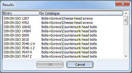 HiCAD will search for catalogues and tables the name of which is contained in the entered string. The found catalogues and tables will be presented in a result list.