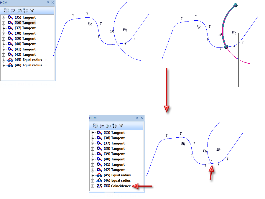 When you move the cursor over the sketch in your drawing, HiCAD will check, depending on the current cursor position, whether the sketch element has any intersection points with other sketch elements. If this is the case, the portion of the element that would be deleted will be highlighted in a different colour (magenta, Special colour Marking 1). The portions of the element that would be preserved as well as their end points will also be highlighted (Special colour Preview). The end points will be represented as small spheres.