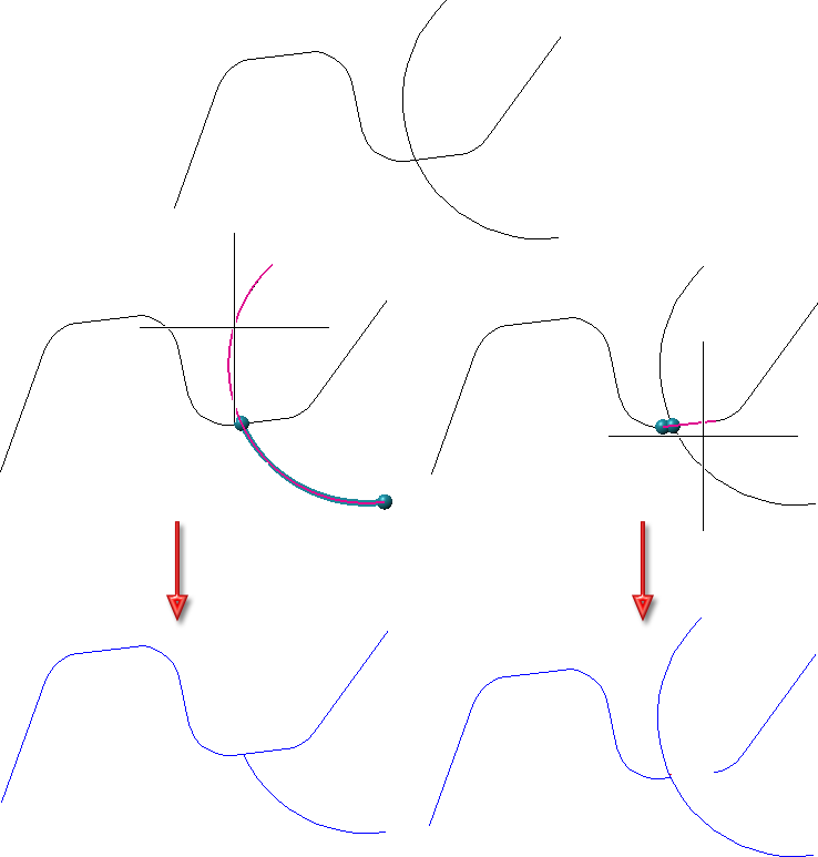Deletes a section of a sketch element up to the nearest intersection point with another sketch element. Intersection points of lines, circular arcs and circles are allowed.