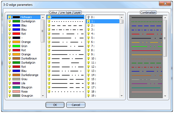 Use this function to change the preset edge parameters, i.e. the colour, line type, layer, and combinations of these parameters. These settings will not be considered for the shaded representation.