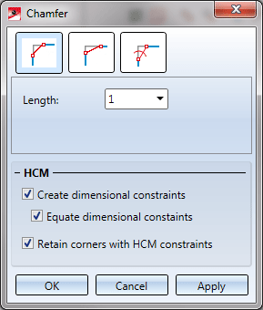 This option is relevant if a HCM constraint has already been assigned to the corner you want to chamfer. If you want to retain the corner as a part of this constraint even after chamfering, activate this checkbox. Otherwise, the constraint will be removed.