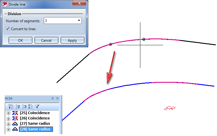 If any HCM constraints had already been assigned to the divided line when you apply the function to it, the following will happen: