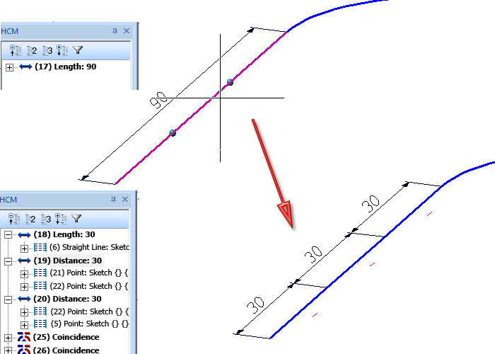 HCM constraints can also be referred to centre points of circles or ellipses. If you divide a circle or an ellipse the HCM constraints of which refer to its respective centre point, one segment ("preferred segment", which will also keep the internal feature name) will keep these HCM constraints at its mid point; the mid points of the other segments, in contrast, will obtain "Coincidence" constraints referring to the mid point of the "preferred" segment.